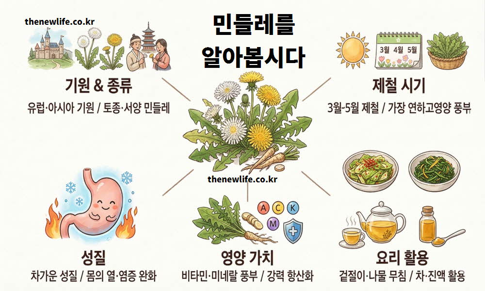 • 민들레 요리 활용: 쌉싸름한 맛을 살려 민들레 겉절이나 향긋한 민들레 나물 무침으로 즐겨 먹고, 말려서 민들레 차나 진액 즙으로도 섭취합니다.